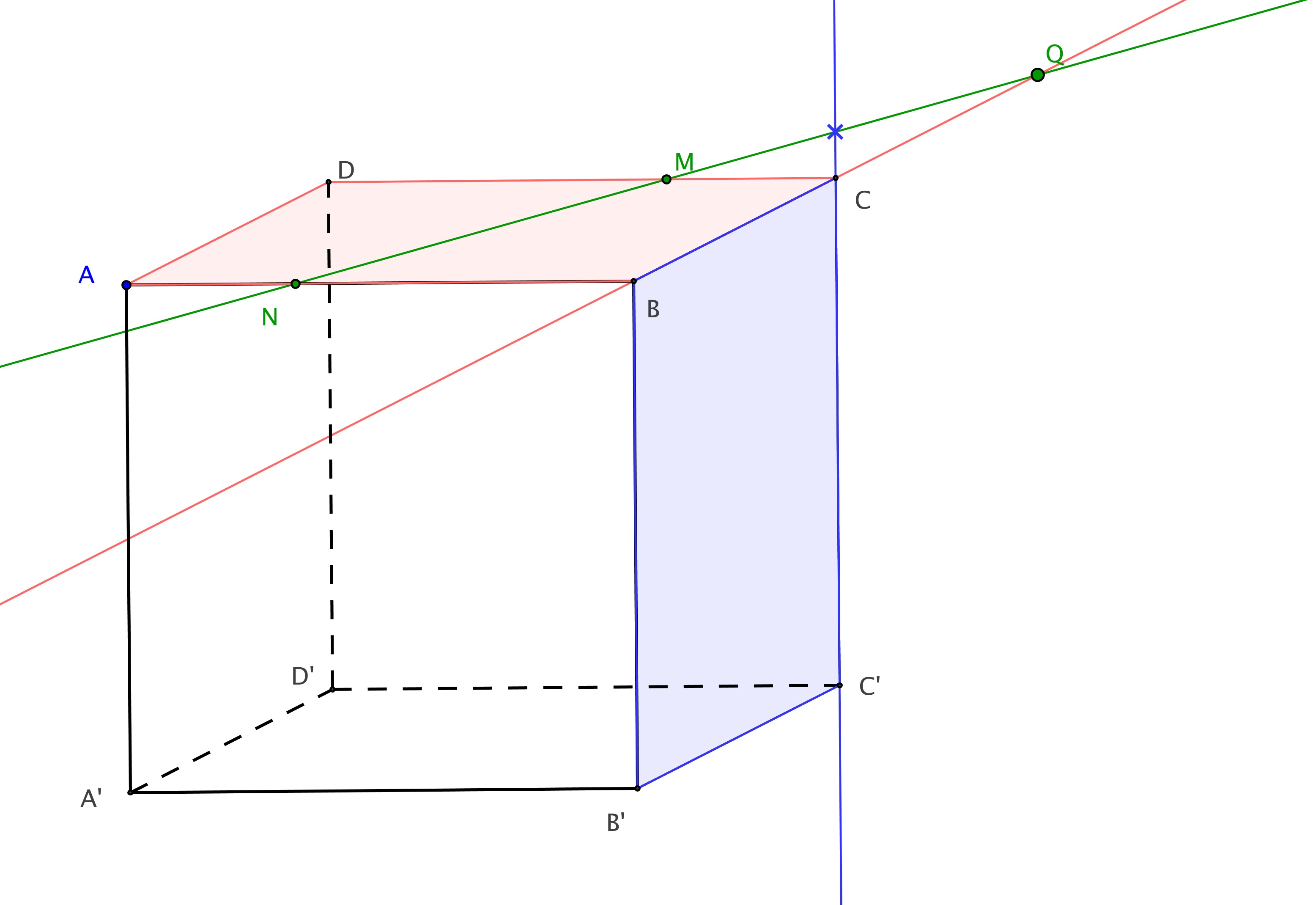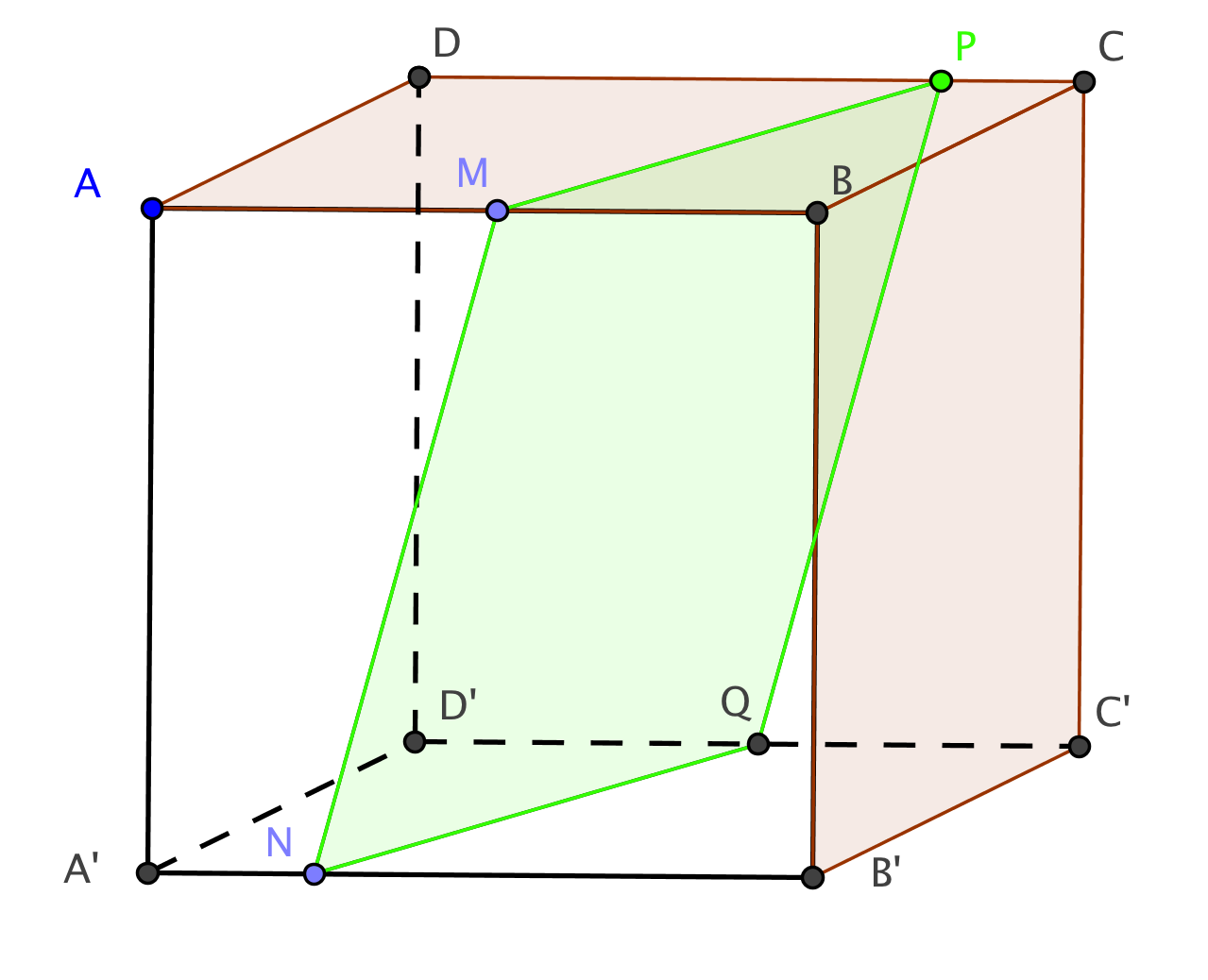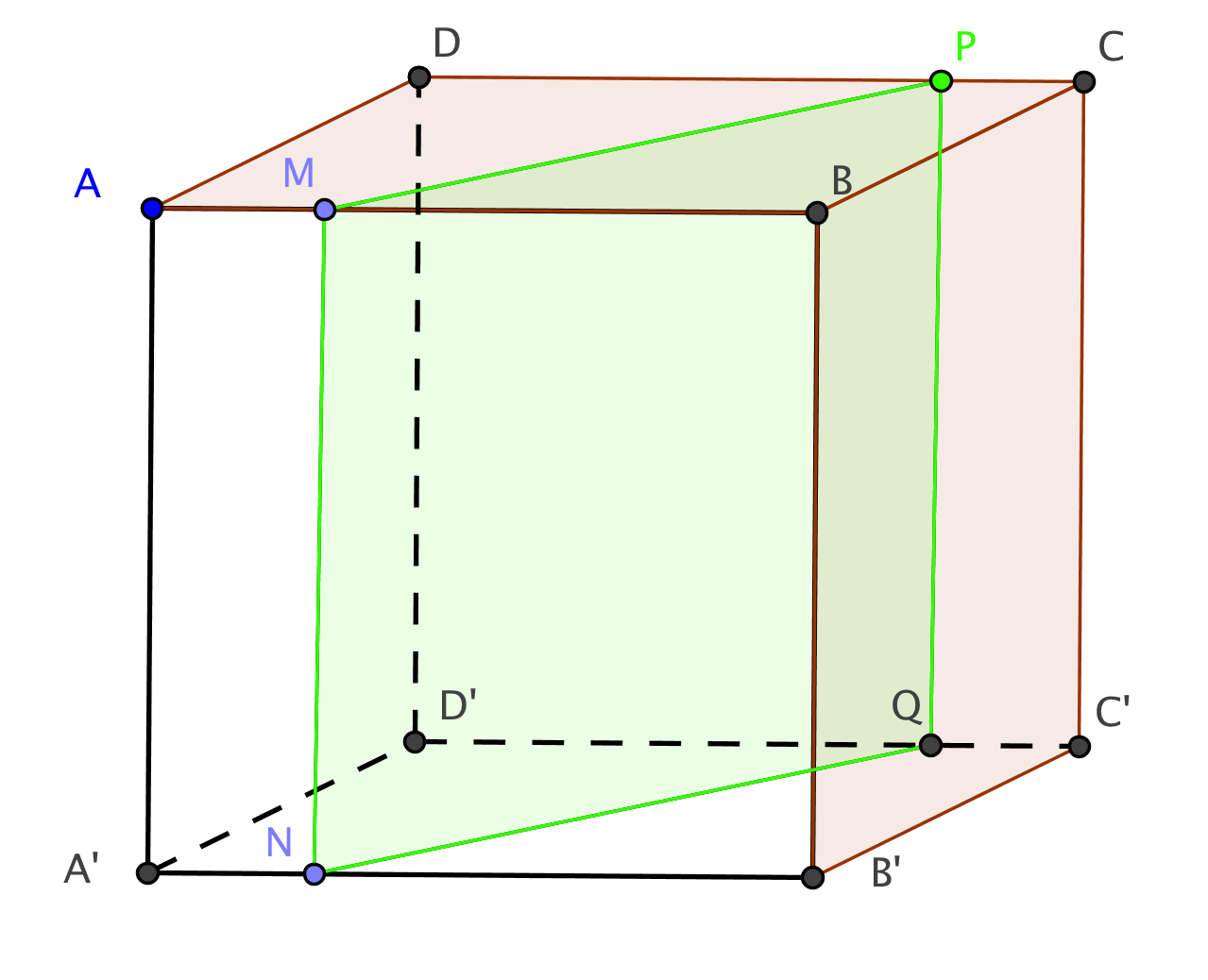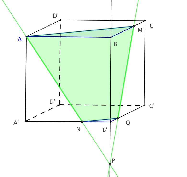 A N B'Q M B du cube située devant ce quadrilatère. Pour ce faire, nous utilisons les pyramides construites pour établir la section.